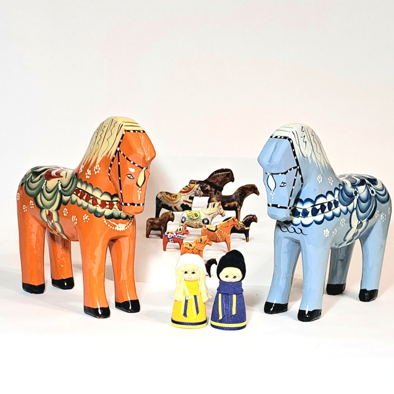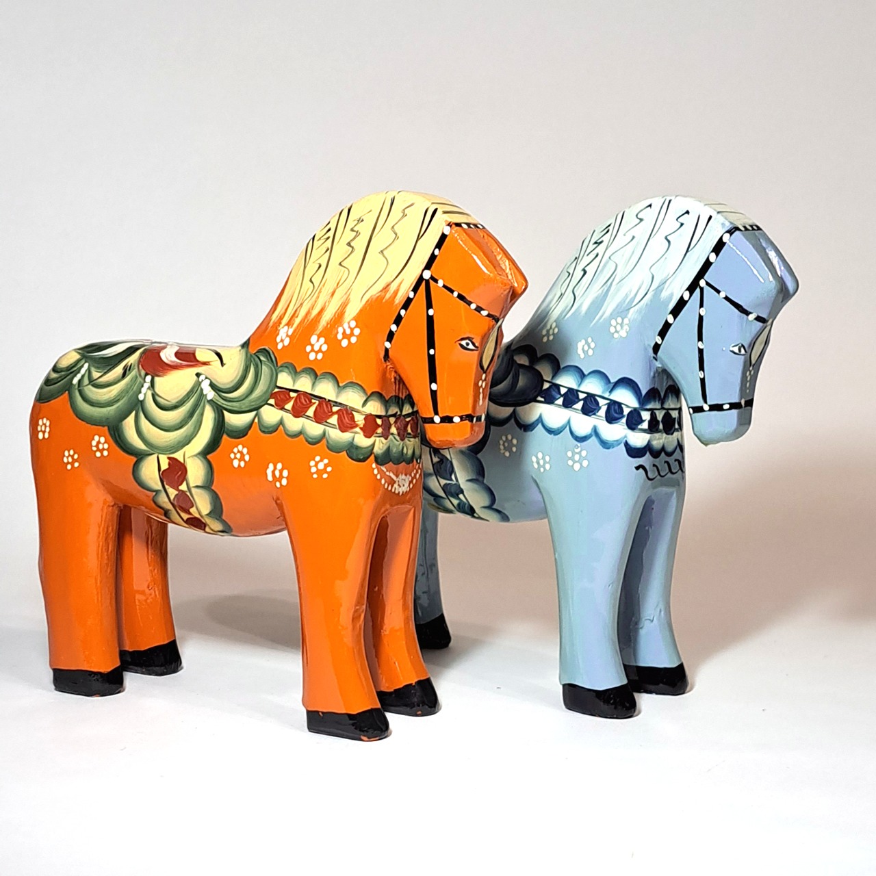 アンティークダーラヘスト 2頭セット Mサイズ 【オレンジレッド&薄いブルー スウェーデンカラーのペアドール】